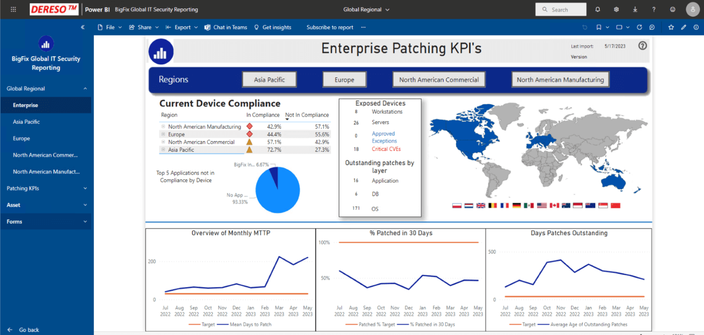 Once global visibility was achieved, ESM Technology built near real-time dashboards for all levels of the organization. They depict operational metrics and allow Genuine Parts Company to improve operational efficiency by providing insight on critical asset mean time to patch, CVE Compliance and over-all performance metrics on Patching KPIs. Operationalizing the global data with the dashboard shown below was the second of the two-pronged approach.